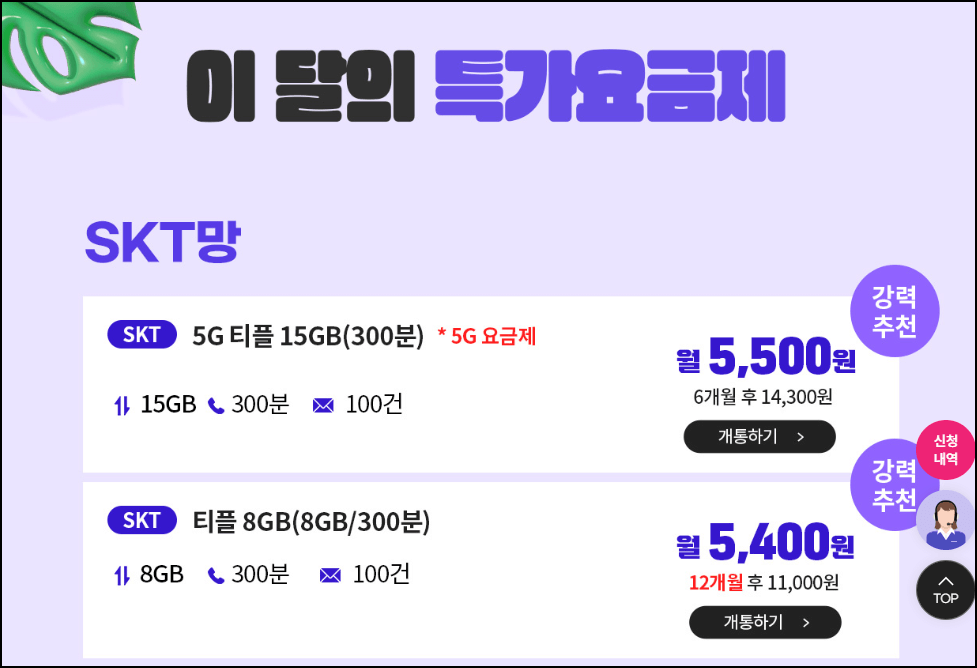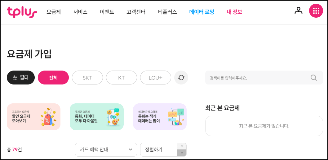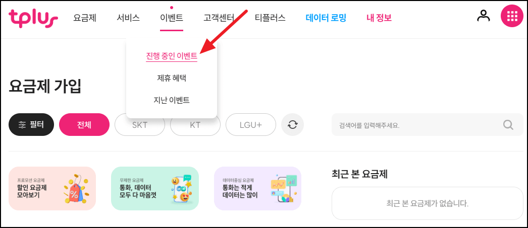 알뜰폰 검색을 해보다가 기존의 SKT 통신사를 이용하고 있어서 알뜰폰 3사 망을 모두 사용하고 있고 규모가 커보이는 티플러스를 선택하게 되었습니다. 티플러스를 방문하면 많은 행사를 진행하고 있으니 본인이 원하는 금액대를 3사 통신망(SKT, LGU+, KT) 모두 확인하실수 있습니다.