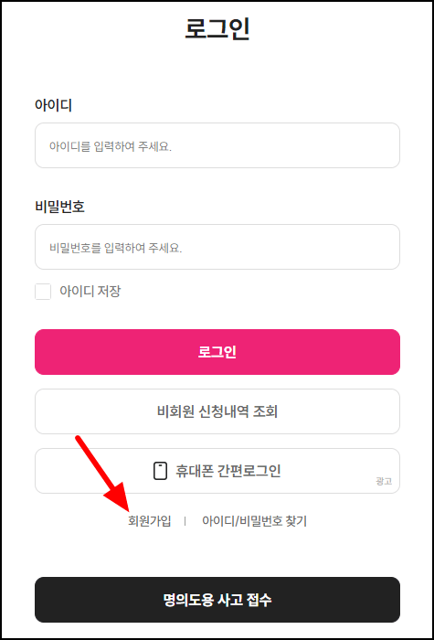 - 로그인화면 하단 '회원가입'을 선택합니다.