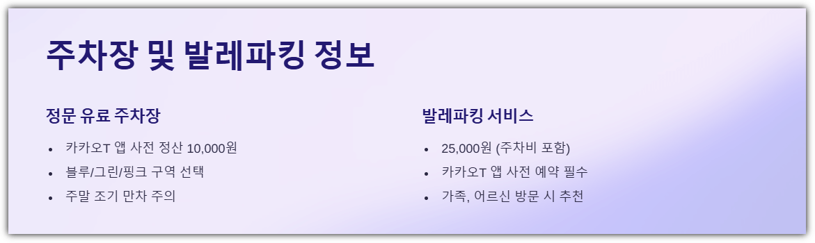 주차장 선택에 따라 입장 대기 시간과 피로도가 달라지며, 발레파킹 서비스는 가족 단위 방문객에게 특히 유용합니다.
