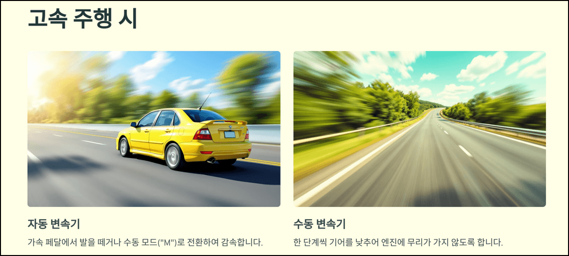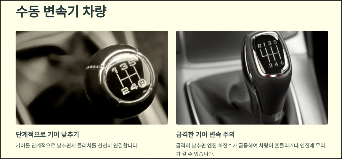 - 수동 변속기: 한 단계씩 기어를 낮추어 엔진에 무리가 가지 않도록 합니다.