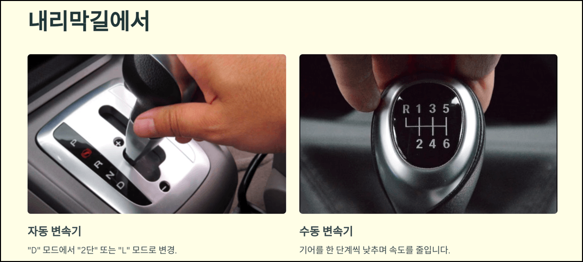 - 수동 변속기: 기어를 한 단계씩 낮추며 속도를 줄입니다. 급격히 변속하면 차량이 흔들릴 수 있으니 주의하세요.