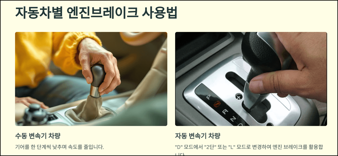 차량의 종류와 변속기 유형에 따라 엔진브레이크 사용법은 조금씩 다릅니다. 각각의 상황에 맞는 구체적인 활용법을 살펴보겠습니다.