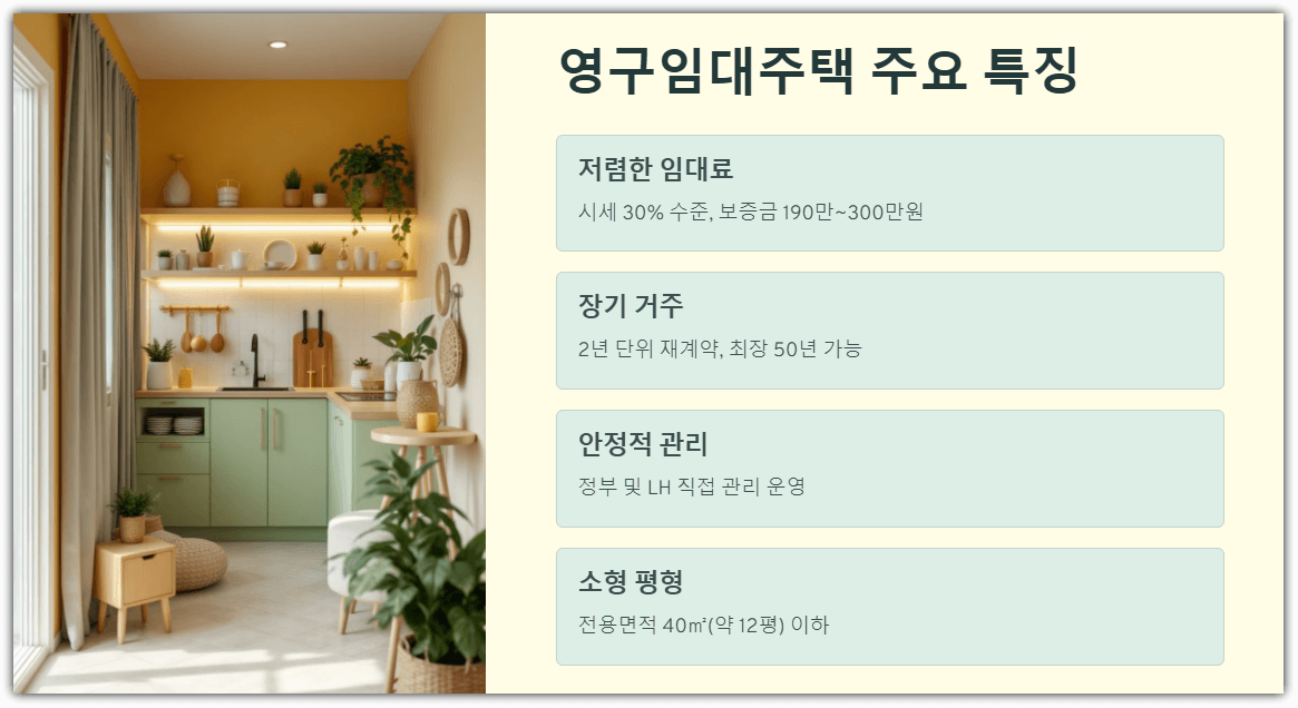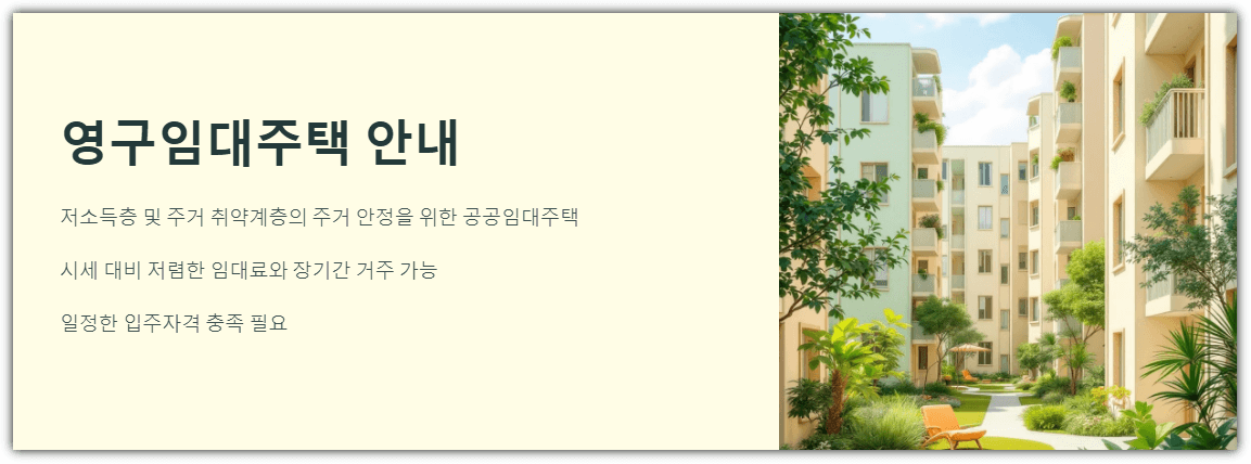 영구임대주택은 정부 및 한국토지주택공사(LH)에서 운영하는 장기 공공임대주택으로, 저렴한 임대료와 장기간 거주가 가능한 것이 특징입니다.