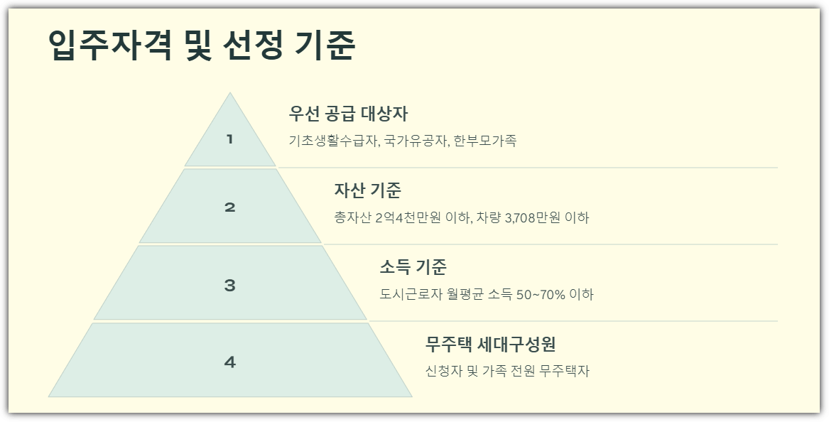 영구임대주택에 입주하려면 소득, 자산, 가구 구성 요건을 충족해야 합니다.