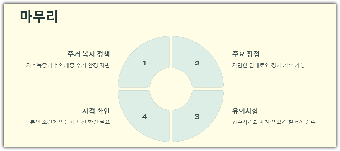 - 정부 및 LH 관리 운영 국가에서 직접 관리하여 안정적인 주거 환경 제공