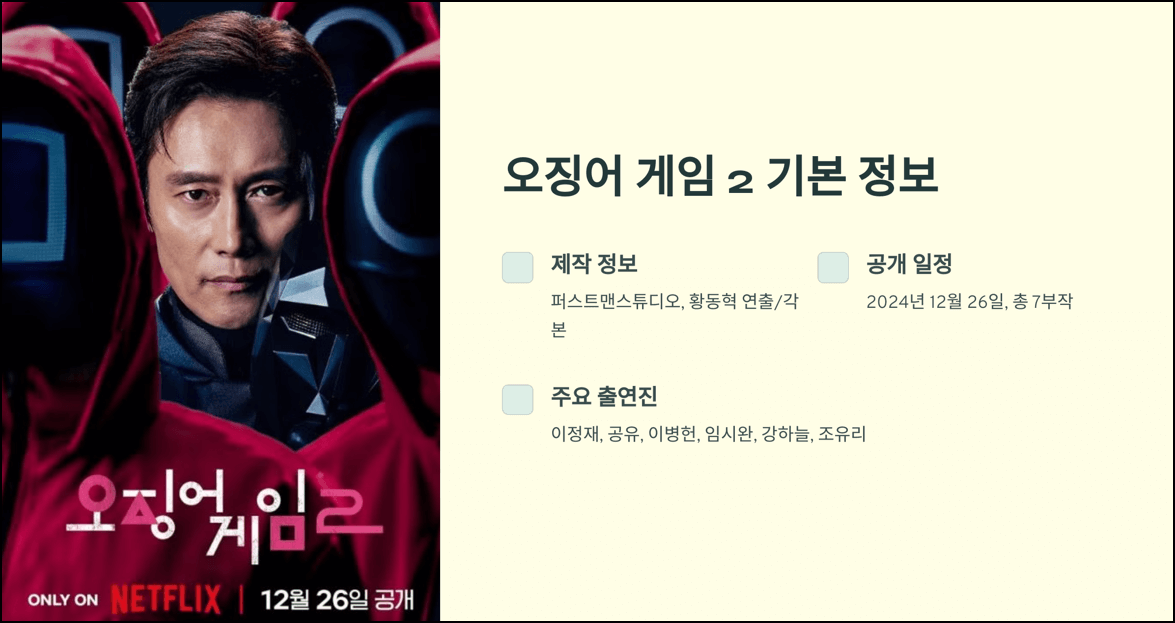 2024년 12월 26일, 전 세계적으로 큰 화제를 모은 넷플릭스 오리지널 시리즈 오징어게임의 속편, 오징어게임2가 드디어 공개됩니다. 시즌 1의 여운을 이어받아 더욱 강렬하고 복잡한 이야기를 예고하며 전 세계 팬들의 기대를 한몸에 받고 있는데요.