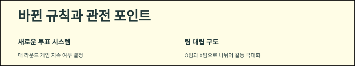 - 새로운 규칙: 게임 중단 투표와 O팀/X팀 구도.