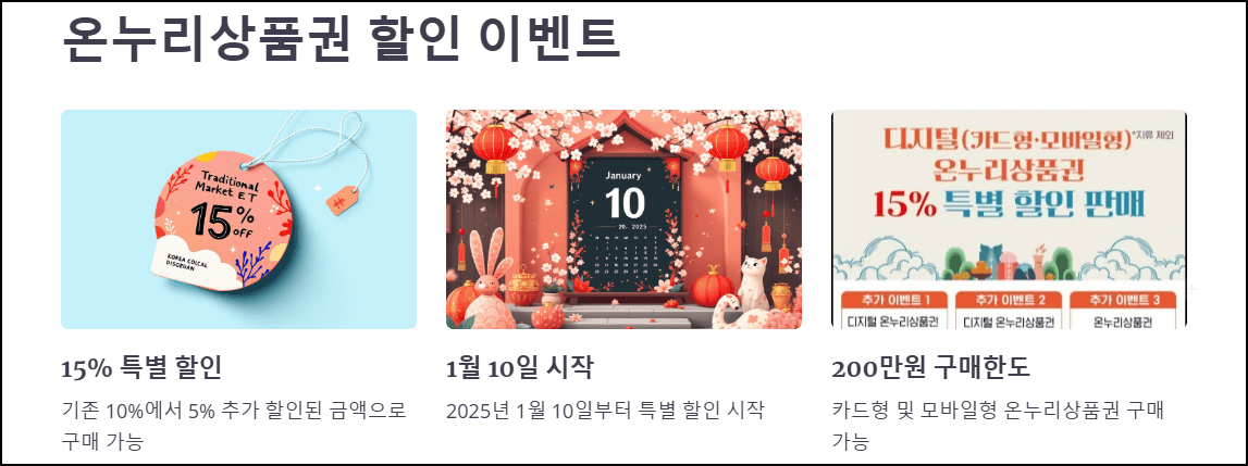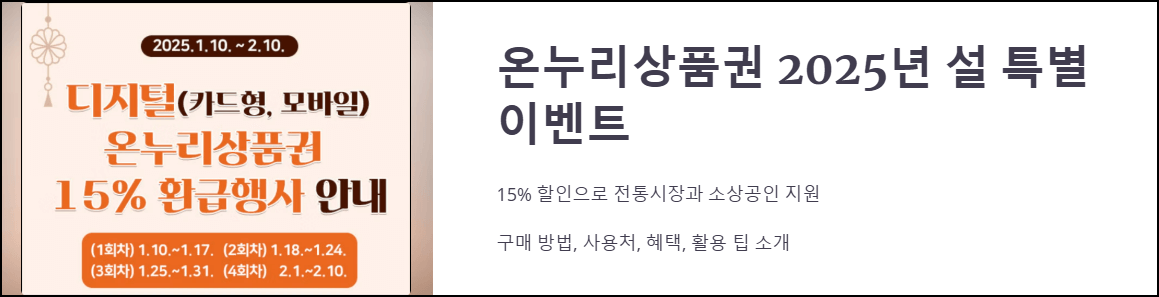 명절 시즌이 다가오면 많은 이들이 전통시장과 소상공인을 지원하면서도 혜택을 누릴 수 있는 온누리상품권을 주목하게 됩니다. 특히 2025년 설 연휴를 맞아 온누리상품권 15% 할인이라는 특별 이벤트가 진행되고 있어 큰 인기를 끌고 있습니다.