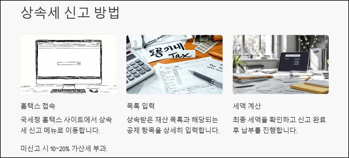 - 신고 기한: 사망일이 속한 달의 말일부터 6개월 이내 신고