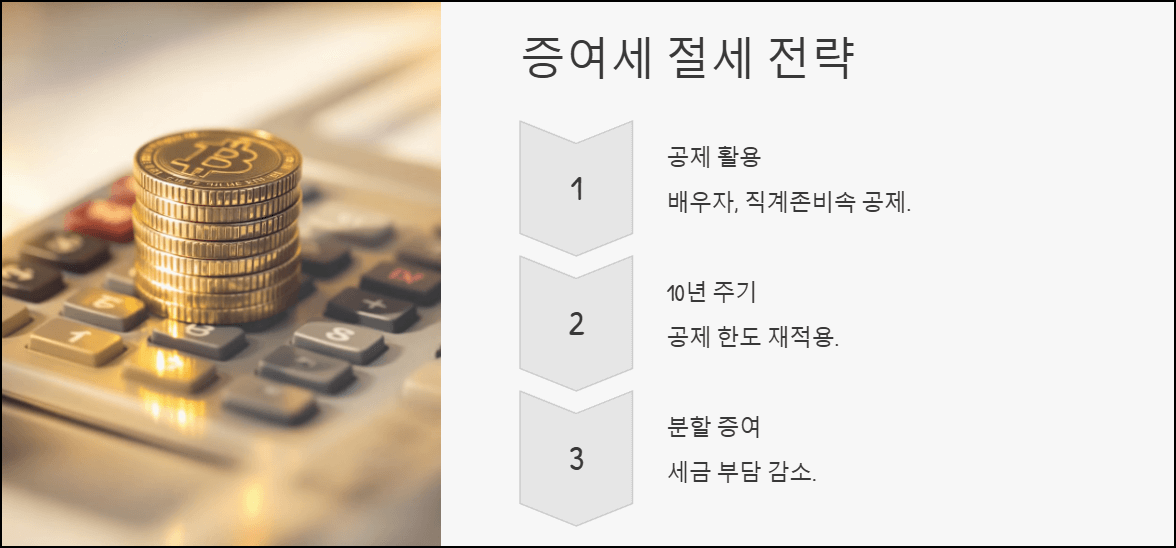 증여세와 상속세는 부담이 클 수 있기 때문에 미리 절세 전략을 세우는 것이 중요합니다. 다음과 같은 절세 방법을 활용하면 세금을 줄일 수 있습니다.