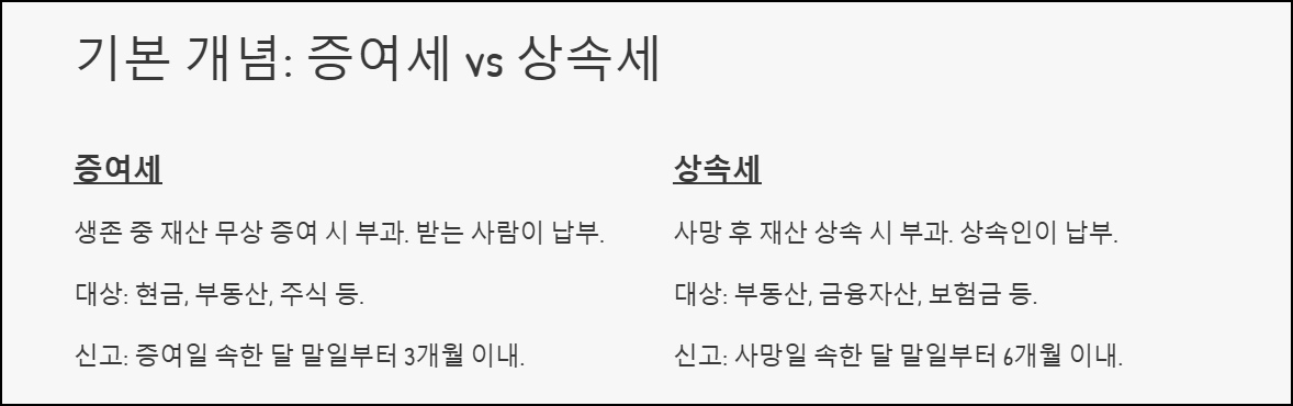 - 📌 증여세는 생전에 재산을 이전하는 세금, 상속세는 사망 후 재산을 상속받을 때 부과되는 세금입니다.