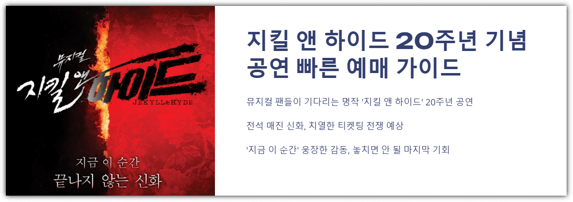 올해도 뮤지컬 팬들이 손꼽아 기다리는 명작, ‘지킬 앤 하이드’ 20주년 기념 공연이 다시 돌아옵니다. 이미 여러 차례 전석 매진 신화를 써온 만큼 이번 시즌도 치열한 티켓팅 전쟁이 예상되는데요. 빠르게 예매하고 싶은 분들을 위해 ‘지킬 앤 하이드 빠른 예매’에 꼭 필요한 정보를 정리해드립니다.