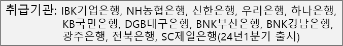 취급기관: IBK기업은행, NH농협은행, 신한은행, 우리은행, 하나은행, KB국민은행, DGB대구은행, BNK부산은행, BNK경남은행, 광주은행, 전북은행, SC제일은행(24년1분기출시)