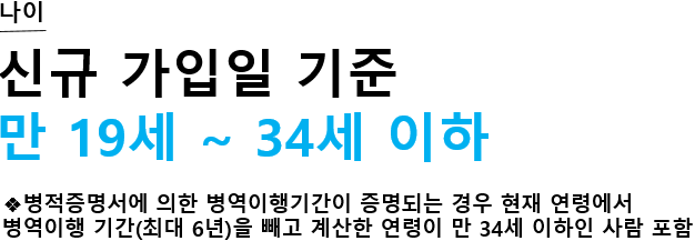 - 신규가입일 기준 만 19세이상 34세 이하까지 가입 가능합니다 병적증명서에 의한 병역이행기간이 증명되는 경우에는 신규 가입일 기준 현재 연령에서 병역 이행기간을 빼고 계산한 연령이 만 34세 이하인 사람도 포함된다는 점