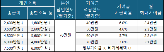 모두가 월 최대 납입한도, 즉 최대 납입할수 있는 금액은 70만원입니다. 하지만 개인 소득 구간별에 따라 기여금 월 적용한도와 지급 비율이 있습니다.