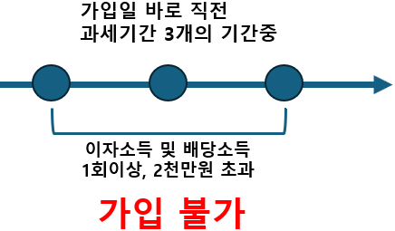- 가입일이 속한 과세기간의 직전 3개 기간중 1회이상 금융소득종합과세대상에 해당하지 않는다면 가입이 가능합니다.
