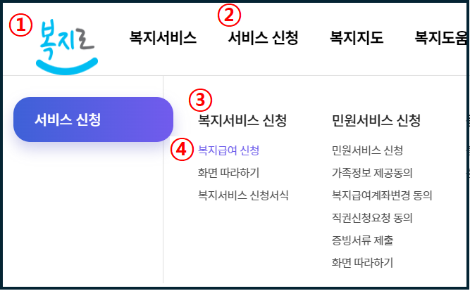 ① 초기 상담및 서비스 신청: 읍,면,동주민센터 혹은 행정복지센터에서 서비스 신청을 접수합니다.