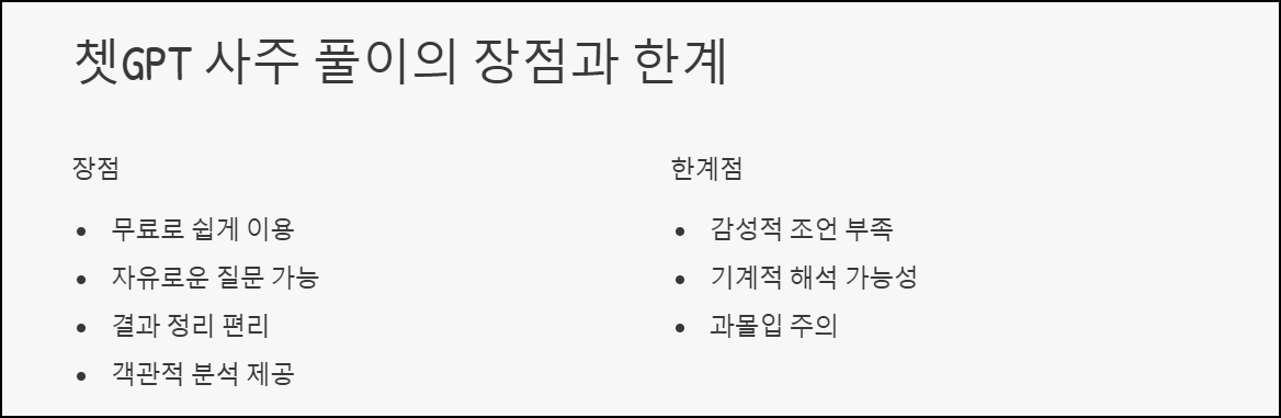 쳇GPT를 활용한 사주 분석은 접근성이 뛰어나고 간편하며 부담 없이 이용 가능하다는 장점이 있습니다. 하지만 몇 가지 한계점도 존재하므로 참고하세요.