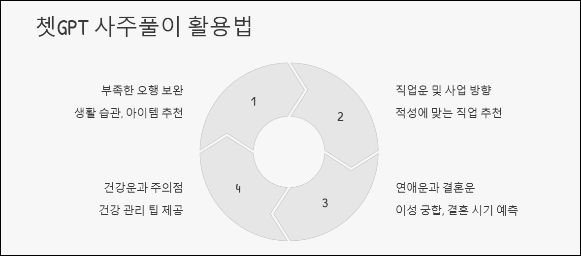 쳇GPT는 다양한 방식으로 사주를 분석해 줍니다. 단순한 사주풀이뿐만 아니라 부족한 기운을 보완하는 방법, 직업 및 연애운까지도 분석할 수 있습니다.