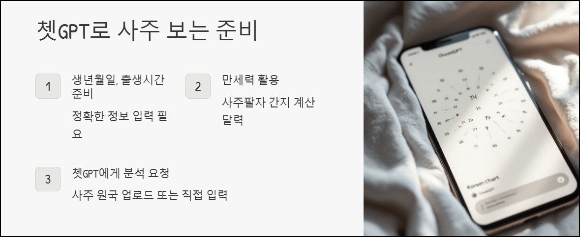 쳇GPT를 활용해 사주를 보려면 기본적인 정보가 필요합니다. 정확한 정보를 입력할수록 더 정밀한 분석을 받을 수 있어요.
