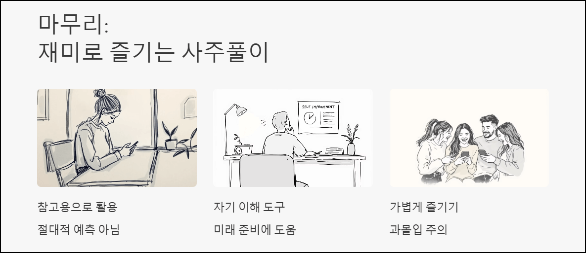 사주풀이를 통해 자신을 더 잘 이해하고, 미래를 준비하는 데 도움을 받는 정도로 가볍게 즐기세요! 😊