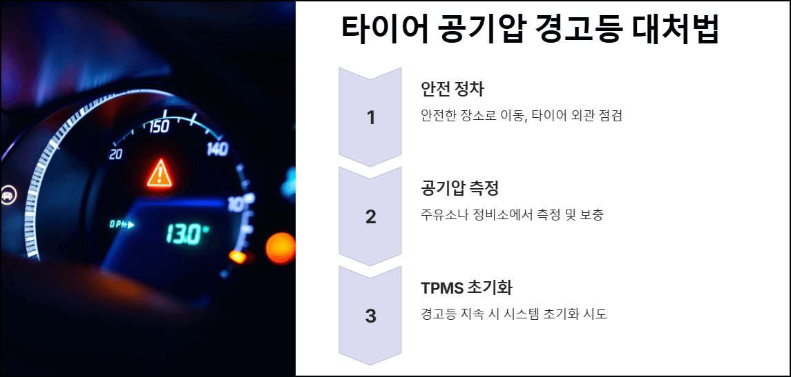 타이어 공기압 경고등(TPMS)은 차량의 타이어 공기압 상태를 실시간으로 감지해 이상을 알리는 시스템입니다. 경고등이 켜졌을 때는 아래 단계를 따라 대처하세요.