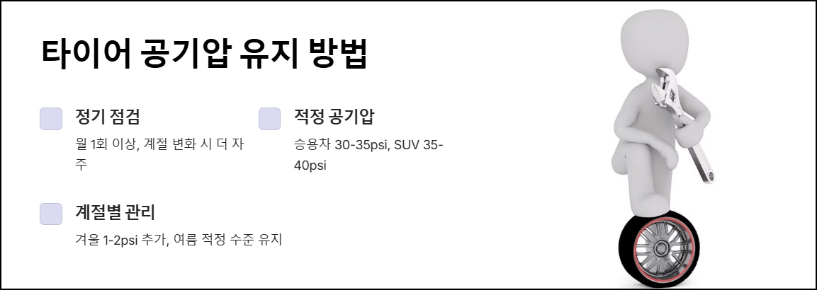 타이어 공기압 관리를 통해 차량의 성능과 안전성을 유지할 수 있습니다. 아래는 공기압을 적절히 관리하는 팁입니다.