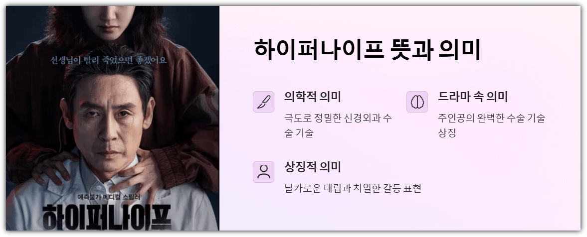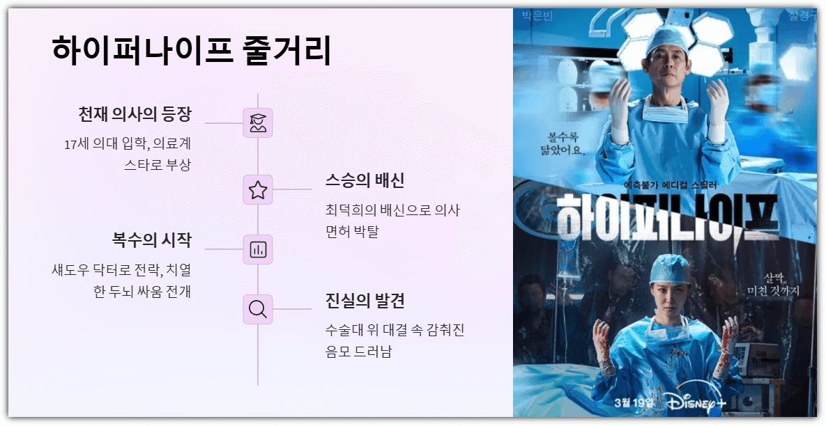 고도의 수술 기술을 뜻하는 ‘하이퍼나이프’라는 제목이 암시하듯, 극 중 등장인물들은 생명을 다루는 의술을 무기로 삼아 복수와 음모 속에서 얽히게 됩니다.