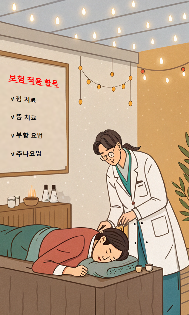 📌 한방병원에서는 침, 뜸, 부항, 추나요법, 일부 첩약 등 치료 항목에 대해 건강보험 적용이 가능합니다.