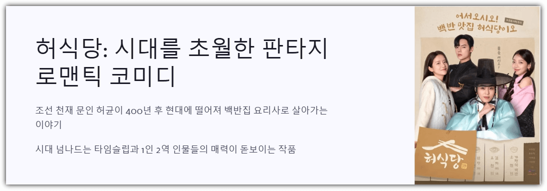 타임슬립 로맨틱 코미디라는 장르 안에서도 '허식당'은 특별한 따뜻함을 전합니다. 단순히 웃기거나 신기한 소재로 끝나지 않고, ‘음식’이라는 매개체를 통해 진심을 전하고, 갈등을 풀며, 사랑과 우정을 키워나갑니다.