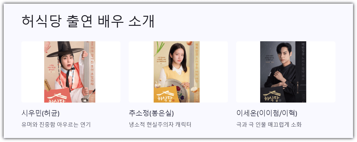 - 시우민(허균 역): 조선의 천재 문인을 연기하며 유머와 진중함을 모두 아우르는 연기로 시청자에게 신선한 매력을 전달.