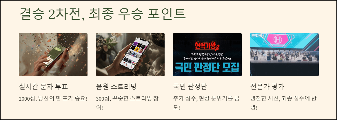 - 실시간 문자 투표 점수 비중이 가장 높음 (총 2000점)