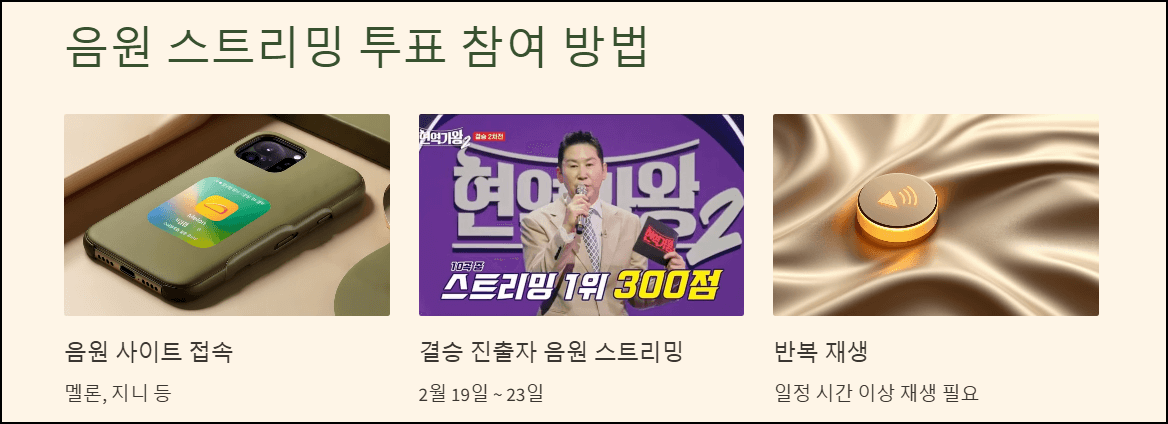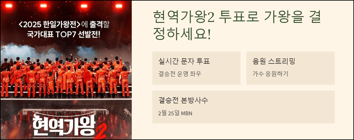 🔥 여러분의 소중한 한 표가 결승전의 운명을 바꿀 수 있습니다. ✔️ 실시간 문자 투표 참여하기 ✔️ 음원 스트리밍으로 가수 응원하기 ✔️ 결승전 본방사수하기