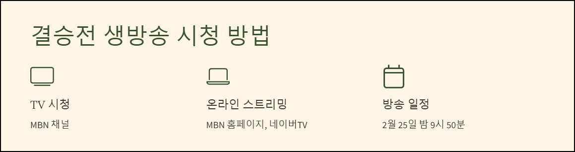 📺 결승전 본방사수 필수! 2월 25일 MBN에서 생방송됩니다.