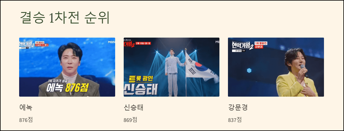 현재 결승전 1차전 결과가 발표되었으며, 1위는 ‘에녹’이 차지했습니다. 하지만 2차전에서는 문자 투표와 음원 스트리밍 점수가 반영되면서 순위 변동 가능성이 높습니다.