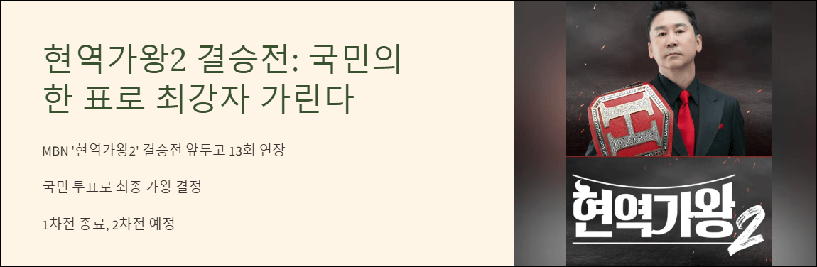 트로트 서바이벌의 최강자를 가리는 MBN의 ‘현역가왕2’가 대망의 결승전을 앞두고 있습니다. 이번 시즌은 총 13회로 연장되며 더욱 치열한 경쟁이 펼쳐지고 있는데요. 국민의 한 표가 최종 가왕을 결정하는 만큼, ‘현역가왕2 투표하기’가 매우 중요합니다.