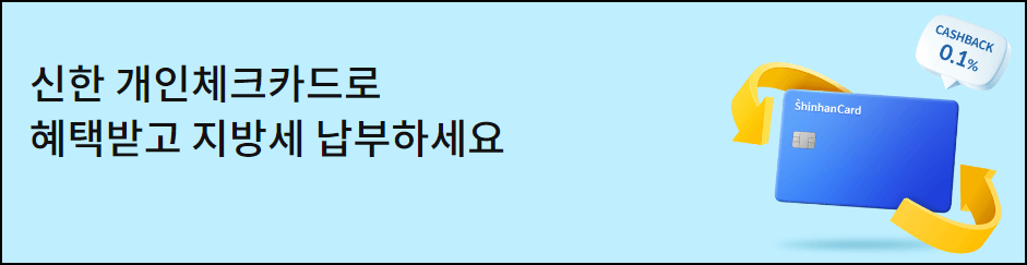 신한카드를 사용하시면 납부금액의 0.1% 캐시백 할인을 받을 수 있는 기회가 주어집니다. 아래 링크를 통하여 바로 할인받아 보세요. 단 체크카드 납부가 아닌 현금 납부 시 지급대상에서 제외됩니다.