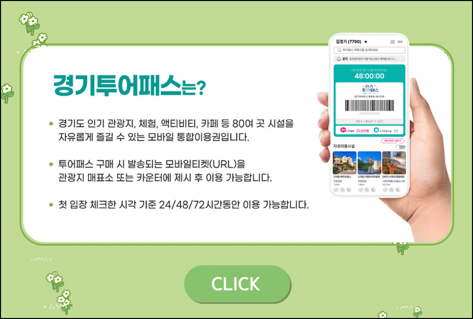 경기투어패스는 단순히 입장권 역할만 하는 것이 아닙니다. 경기투어패스는 19,900원의 저렴한 비용으로 경기도의 주요 관광지와 체험관 및 카페등을 이용할 수 있습니다.