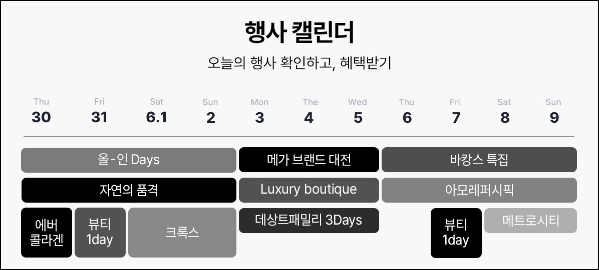 - 제휴 카드 사은 + 단일 브랜드 5% (5.31 - 6.2) + 해외/컨템포러리 5% (6.6 - 6.9)