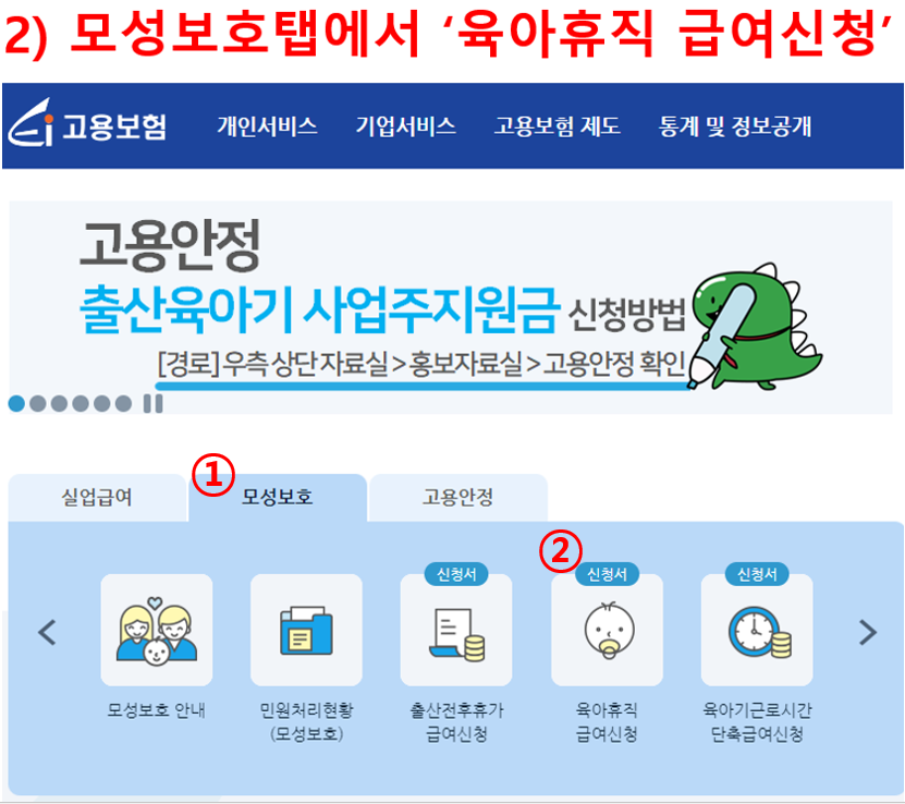 *육아휴직 시작후 1개월부터 신청 가능 - 지급요건 심사 및 지급 고용선터-->근로자