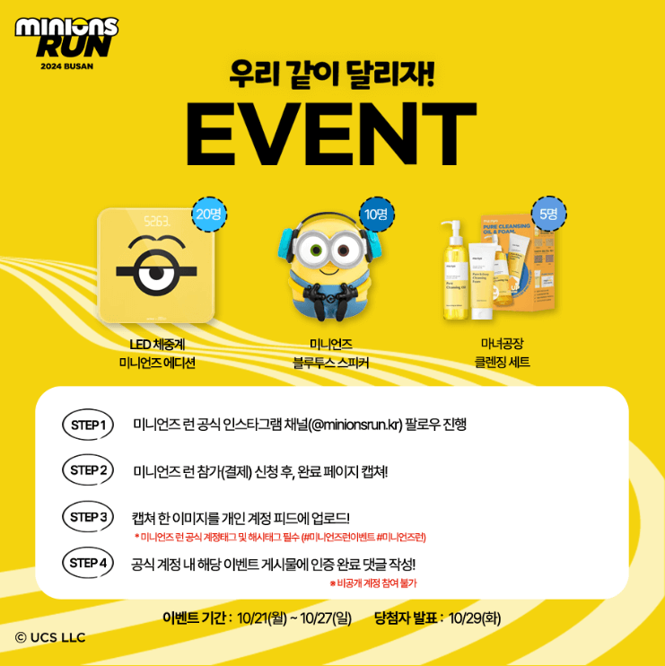 참가자 모두에게 미니언즈 테마의 공식 기념품 패키지가 증정되며, 추가 현장 이벤트도 준비되어 있습니다.