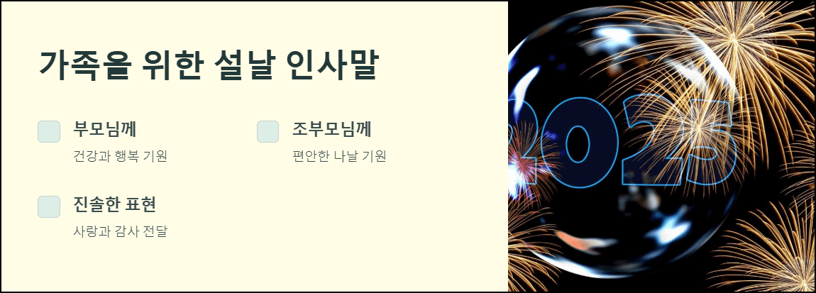 설날은 가족 간 사랑과 감사를 나누는 시기입니다. 진솔한 표현으로 가족의 마음을 따뜻하게 해보세요.