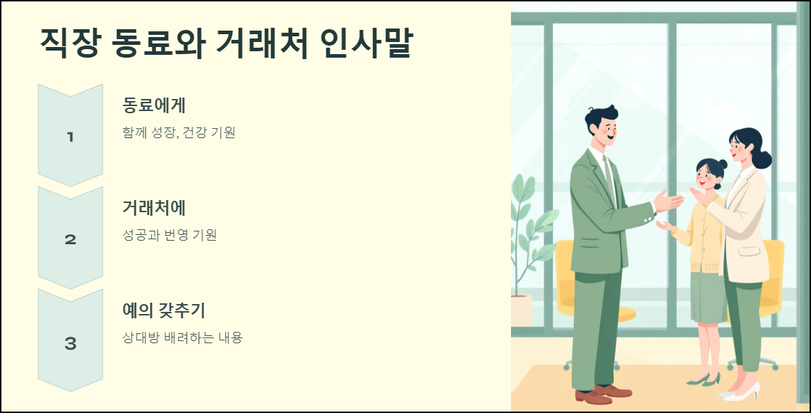 직장에서 동료들과 거래처에 전할 인사말은 예의를 갖추면서도 상대방의 기분을 배려하는 내용이 중요합니다.