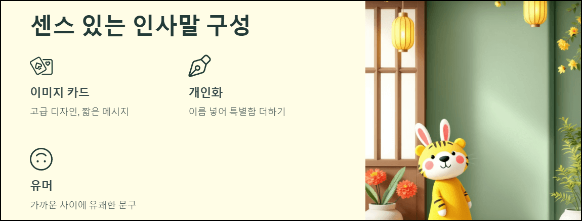 설날 인사말을 보낼 때는 상황에 맞춰 조화롭게 구성하는 것이 중요합니다. 받는 이의 성향과 관계에 따라 문구를 조절해보세요.