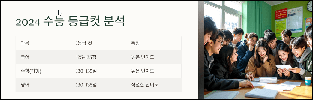 국어 과목의 경우 1등급 컷은 약 125점에서 135점 사이로 나타났습니다. 비교적 높은 난이도 때문에 1등급 기준이 낮게 형성되었으며, 이는 수험생들의 전반적인 학습 방향에 큰 영향을 주었습니다.