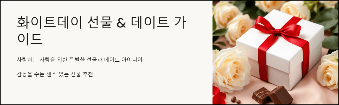 화이트데이는 선물뿐만 아니라 특별한 이벤트를 준비하는 것도 좋은 방법입니다. 사랑하는 사람과 잊지 못할 하루를 만들 수 있도록 감동적인 데이트 코스와 서프라이즈 이벤트를 계획해보세요!
