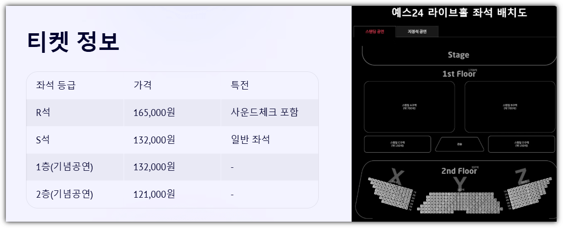 좌석 종류에 따라 가격이 다르며, 일부 좌석은 사운드체크 등 특별 혜택이 포함되어 있습니다.