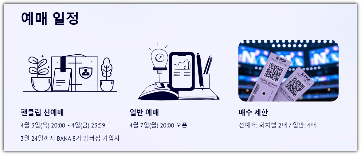 - 팬클럽 선예매: 2025년 4월 3일(목) 20:00 ~ 4월 4일(금) 23:59