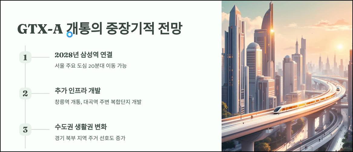 - 2028년 GTX-A 노선이 서울 강남권까지 확장될 예정.