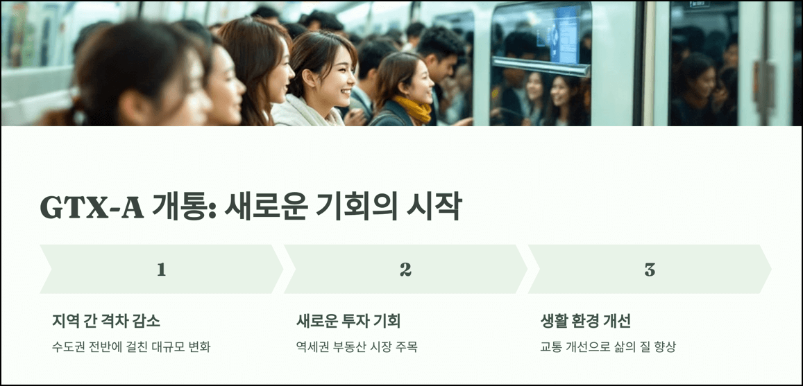 GTX-A 노선의 개통은 단기적으로 교통 여건 개선과 부동산 상승을 가져오겠지만, 중장기적으로는 수도권 전역에 걸쳐 여러 변화를 예상할 수 있습니다.